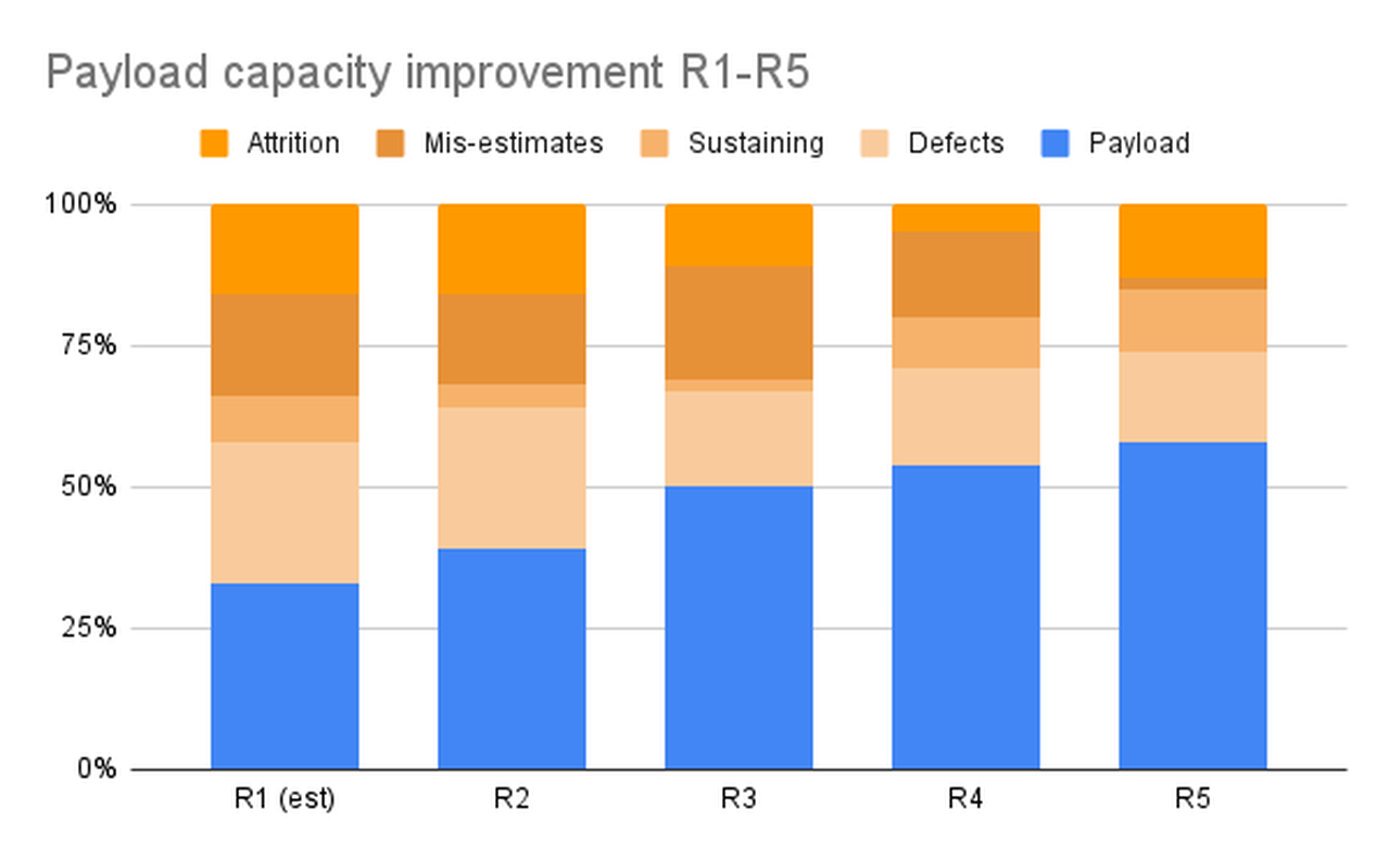 By FR-6, we achieved 65% payload thanks to improvements in field quality, test automation, DevOps, reduced outsource turnover, and improved developer productivity from more completed work and less planning waste. We continued to scale the team globally: where we had started with two large employee sites and one sizeable outsourced vendor, we entered FR-6 with a third large employee site and two more outsourced vendors to add scale and reach.