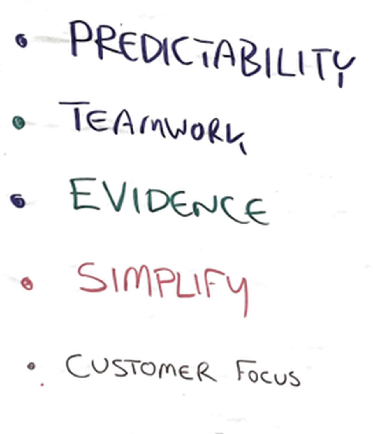 In our shared conference room, I hung a handwritten poster emphasizing five critical points to remember as we changed how we worked. Predictability, Teamwork, Evidence, Simplicity, and Customer focus became the principles that drove our transformation. In our operating plan, we defined and expanded on these ideas.
