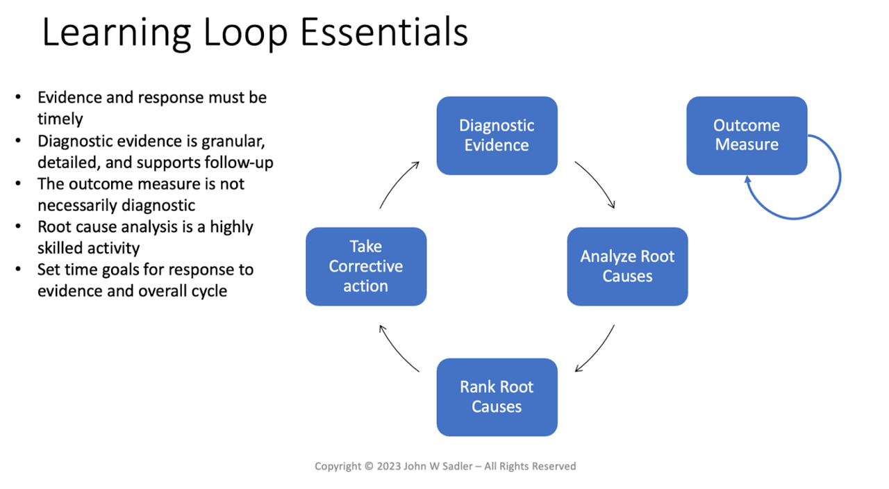 So what does it take to drive continuous improvement? Critical characteristics are: Timely, diagnostic evidence that is used to analyze the root causes of problems followed by corrective action on a cadence.