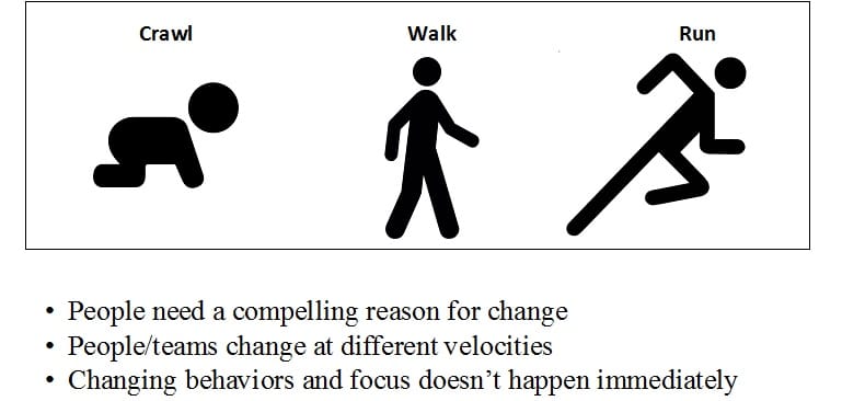 Unfortunately, the move toward Agile requires cultural and organizational change for the business and the project management team – both of which can be difficult. Agile requires a culture where teams promote collaboration up and down the organization and the functional chieftains tend to resist what they see as a loss of influence. Managing this change requires breaking the momentum of what your were doing yesterday in order to behave differently today.