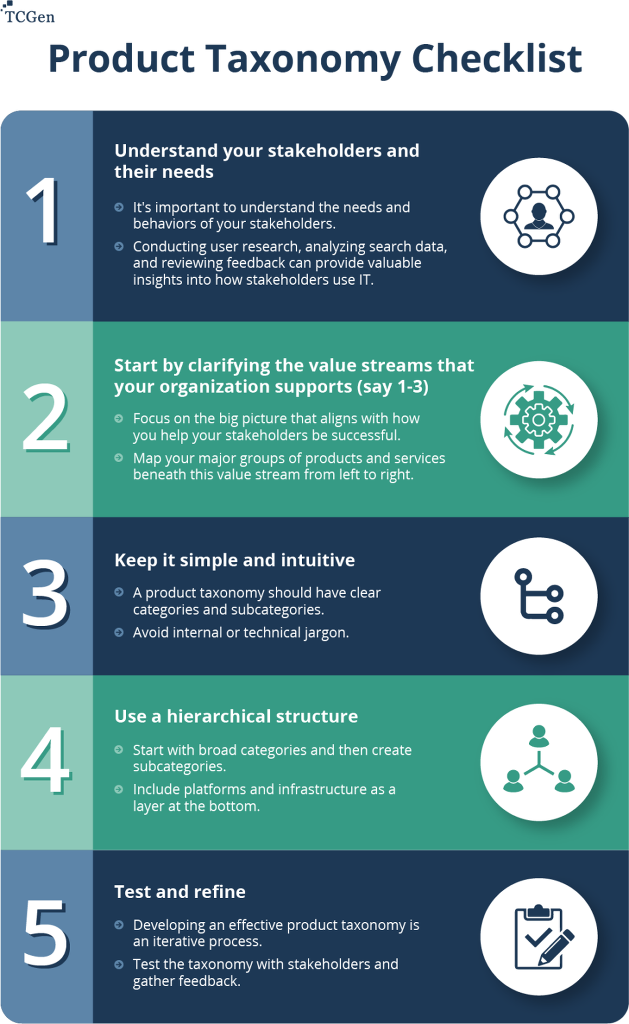- Test and refine Developing an effective product taxonomy is an iterative process. Test the taxonomy with business stakeholders and gather feedback on its effectiveness. Use analytics to track how people are using the taxonomy, and make adjustments based on their behavior and feedback.